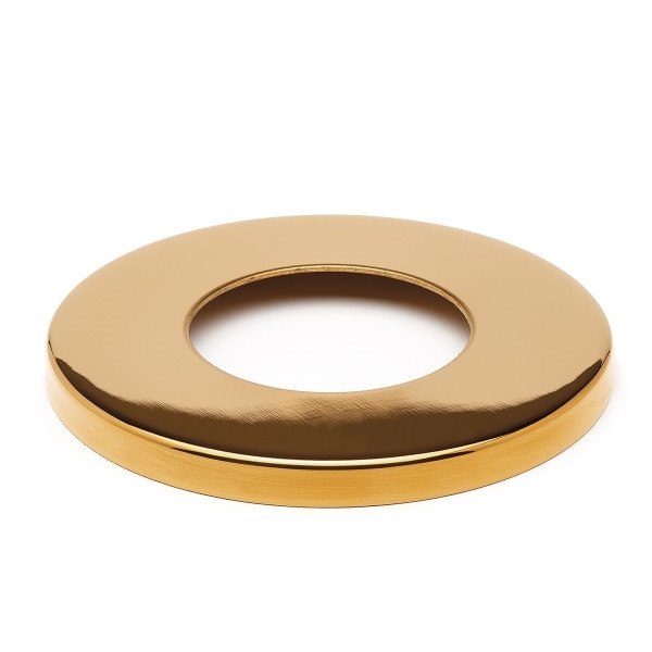 Täckrosett för Ø38,1 mm rör i mässing-look. Används som avslutning där röret möter golv, vägg eller tak och där man vill ha en ren och täckande kant runt röret. Rosetten monteras tillsammans med en golvfläns, där flänsen fungerar som underbeslag och täckrosetten därefter döljer monteringspunkterna och ger en slät övergång mellan rör och yta. Rosetten förs ned över röret och placeras mot underlaget.